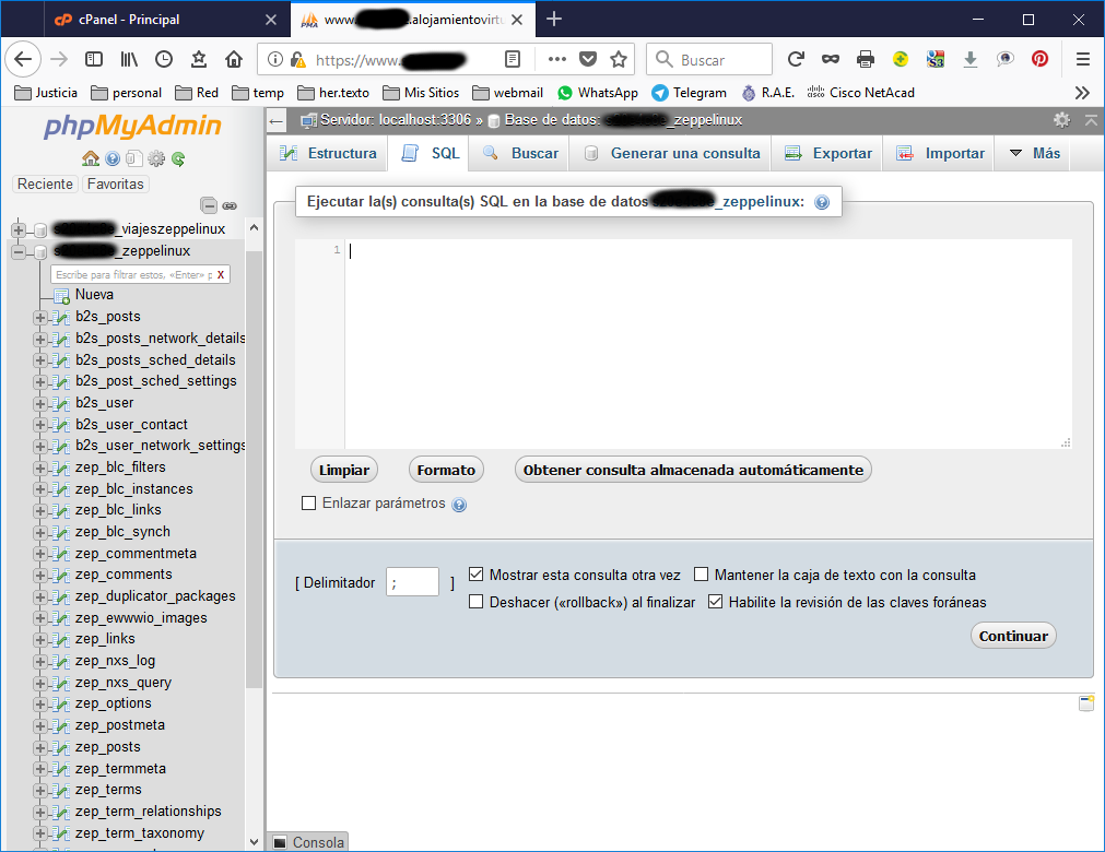 Nota: Por defecto, al instalar WordPress, las tablas se crean con el prefijo wp_. Si hemos cambiado durante la instalación el prefijo de las tablas, habrá que tenerlo en cuenta a la hora de ejecutar las órdenes. En nuestro caso, en la instalación, optamos por cambiar el prefijo a zep_, pero la sintaxis que emplearemos para la solución del problema será utilizar el prefijo por defecto.