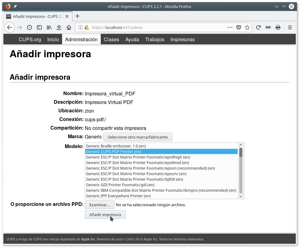 CUPS: Sseleccionamos el modelo de impresora Generic CUPS-PDF Printer (en)