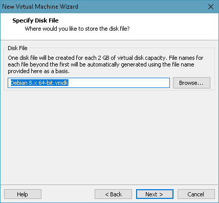 Figura 12: Seleccionar la capacidad del disco. Con 20GB bamos sobrados y seleccionaremos la opción de dividir en múltiples archivos Figura 12: La elección de dividir en multiples archivos es interesante a la hora de hacer copias de seguridad de nuestras máquinas virtuales. Sobre todo si hacemos copias de sólo archivos que han cambiado. Si tenemos discos virtuales muy grandes 40GB o más, debido a que cada vez que ejecutamos la máquina virtual, el disco cambia, simpre tendremos un archivo de 40GB o más a copiar, mientras que si lo dividimos en múltiples archivos, y utilizamos un sistema de copia de seguridad que contemple la modificación en archivos, sólo se copiarán los que hayan cambiado, lográndose una copia más rápida.