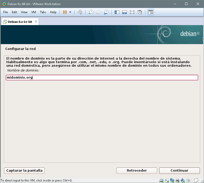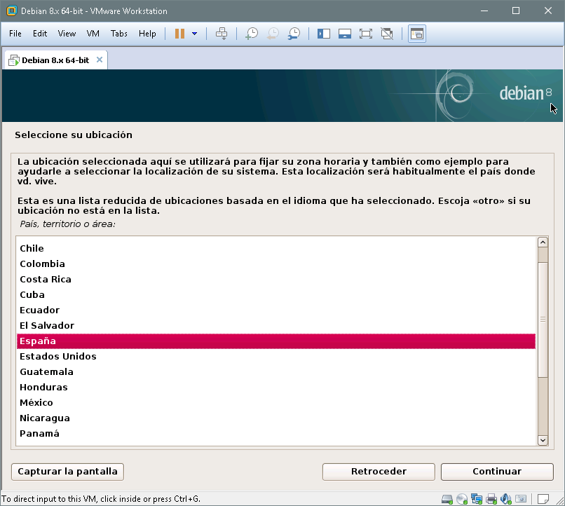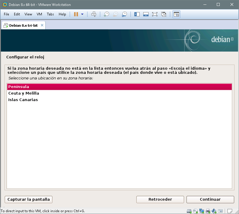 Una vez configurada la máquina virtual procedemos a la instalación de Debian 8. Como indicamos en la Figura 15 del apartado anterior, para iniciar la instalación deberemos pulsar sobre Power on this virtual machine.NOTA: Una vez en la interfaz de instalación, como por ejemplo en la Figura 3, podemos seleccionar las opciones con tabulador, flechas de desplazamiento o ratón, según el tipo de opciones disponibles. Cuando seleccionamos una opción, quedará realzada en tono rojizo. Para modificar la opción, hacer doble clic o tras seleccionarla hacer clic en continuar.
