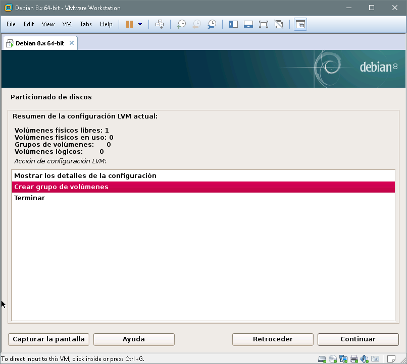 Figura 39: En este punto se nos muestra un resumen de la configuración LVM actual y seleccionamos la opción "Crear grupo de volúmenes" En la Figura 39 comenzamos el proceso de crear un grupo de volúmenes (VG) donde albergaremos dos volúmenes lógicos (LV). Uno para los directorios de los usuarios /home y otro para archivos variables, tales como logs, archivos spool, bases de datos, archivos de e-mail, archivos de hospedaje web. Será para el directorio /var.
