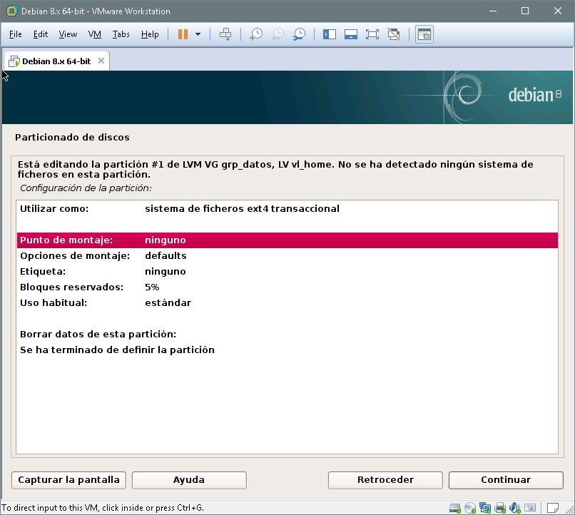 Figura 51: Una vez creados los "volúmenes lógicos" tendremos que asignarles sus correspondientes puntos de montaje. Empezaremos por "/home"