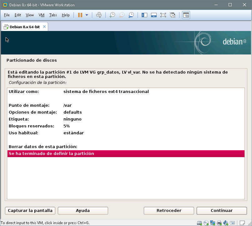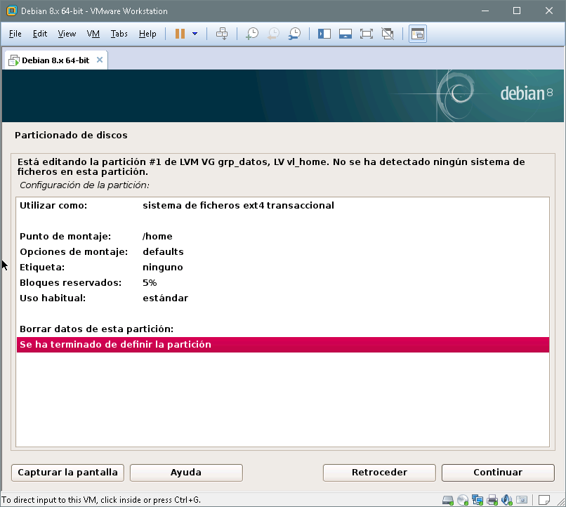 Resumiendo, hemos creado una máquina virtual para la instalación de Debian 8 con LVM. En la instalación la hemos dotado de tan solo 20GB de disco duro de los cuales hemos dedicado 9.5GB pare crear dos volúmenes lógicos: vl_var para el directorio /var, que inicialmente le hemos asignado 4.16GB y vl_home para el directorio /home, que inicialmente le hemos asignado 4.66GB.En el artículo Extender volúmenes LVM (Logical Volume Manager) hablaremos brevemente sobre LVM y se muestra como añadir un disco duro adicional de otros 20GB, y haciendo uso de la interfaz para la línea de comandos (CLI), expandir el volumen lógico vl_var para el directorio /var en 15GB y el volumen lógico vl_home para el directorio /home en 4.99GB, además, se muestraa como añadir otro disco duro adicional de 10GB que haciendo uso de la herramienta gráfica system-config-lvm, extenderemos de nuevo el volumen lógico vl_var para el directorio /var en 10GB.