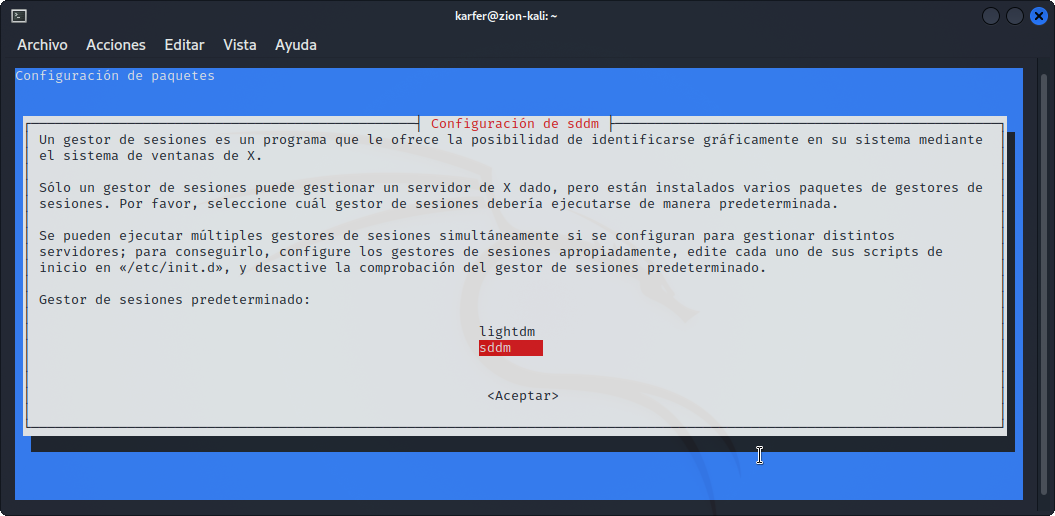 En algún momento de la instalación de los paquetes, se nos pedirá que seleccione el gestor de sesiones. Se mostrarán dos opciones Lightdm y SDDM, seleccionaremos SDDM y presionaremos la tecla Enter. Haz clic en la imagen para aumentarla