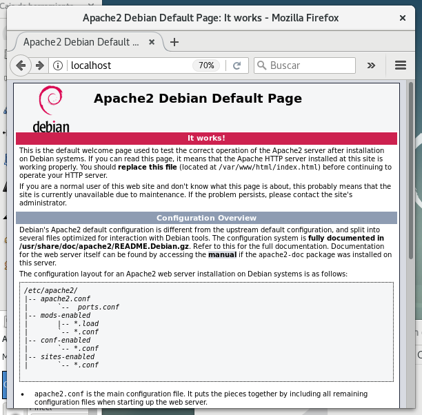 La instalación por defecto de Apache incluye una página de bienvenida. Si en el navegador ingresaremos la URLhttp://localhost