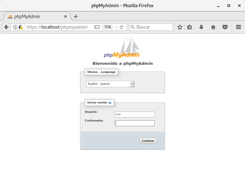 En el navegador ingresaremos la URLhttps://localhost/phpmyadmin