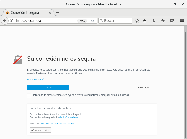 Tras ejecutar los comandos anteriores, ya tendremos configurado nuestro Apache para servir conexiones seguras, pero con una salvedad, y es que el certificado que usa es uno que se instala por defecto.