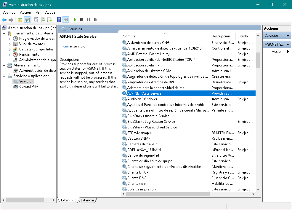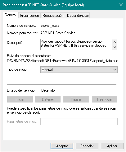 - Servicio de Estado de ASP.NET (ASP.NET State Service): Este servicio sólo debería estar ejecutándose si el PC está funcionando como servidor que procesa requerimientos ASP. También si se utiliza la aplicación Norton Ghost. Almacena los datos de sesión fuera del proceso.