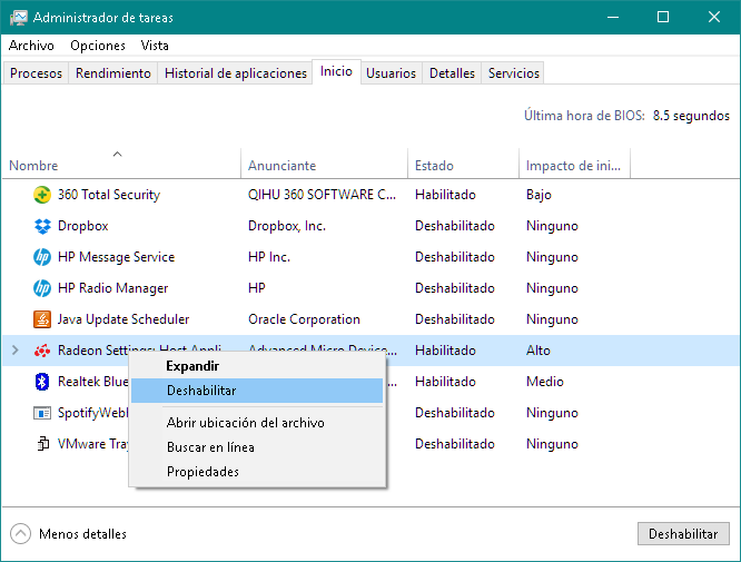 - Una vez abierto el Administrador de tareas hacemos clic en la pestaña Inicio. Seleccionamos los programas que no queremos que se inicien de forma automática y haciendo clic con el botón derecho del ratón sobre el programa, seleccionamos del menú contextual Deshabilitar.